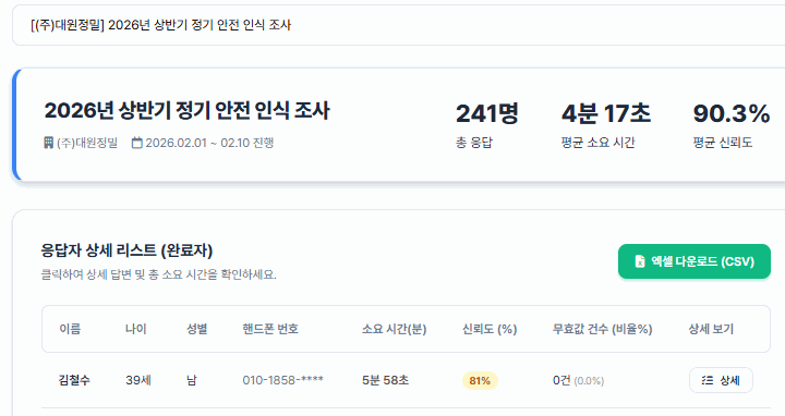 답변 속도, 패턴, 함정 질문 분석을 통해 불성실 응답을 실시간으로 필터링합니다.