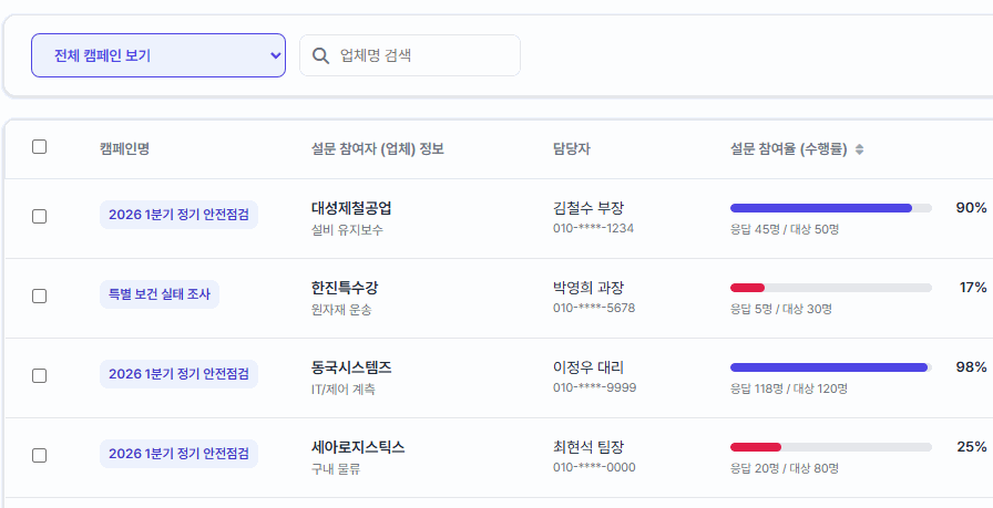 프로젝트 담당자 및 관리자별로 고유 식별 코드(Unique Link)를 생성하여 배포합니다. 이를 통해 채널별 유입 경로와 진행률(Progress Rate)을 실시간으로 추적할 수 있으며, 참여가 저조한 구간을 즉각 파악하여 타겟팅 독려(Reminding)를 수행하는 등 효율적인 필드 관리가 가능합니다.
